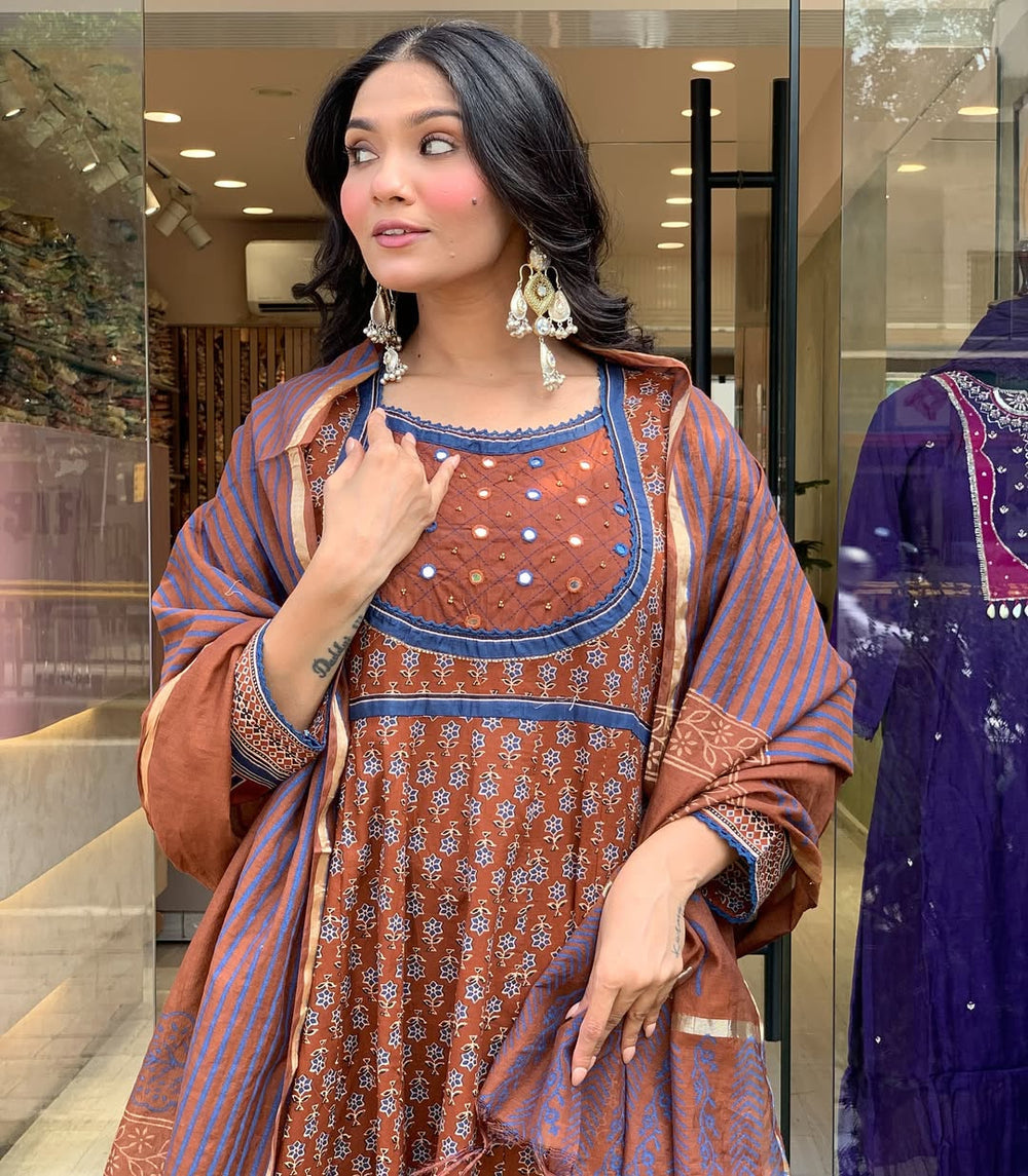 Elevate your ethnic fashion with this exquisite Cotton 60×60 Anarkali Suit Set, crafted for women who love elegance blended with comfort. The kurta features rich original mirror hand embroidery, adding sparkle and depth to the traditional prints. Paired with a comfortable cotton pant and a beautifully designed Mayur hand-embroidered dupatta, this outfit delivers a premium ethnic look suitable for festive events, parties, family gatherings, or elegant outings.